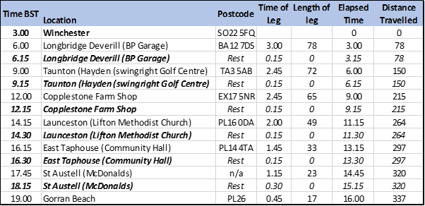 Our ambitious target is to raise £10 for every Kilometre ridden, a total of £3,250. So, with a week to go we are over 237 Km of the way there. Or put another way, on the ride from Winchester to Gorran Haven, we have just about passed Oakhampton! Every possible support to achieve those final 100 Kilometers will be hugely appreciated.